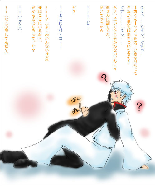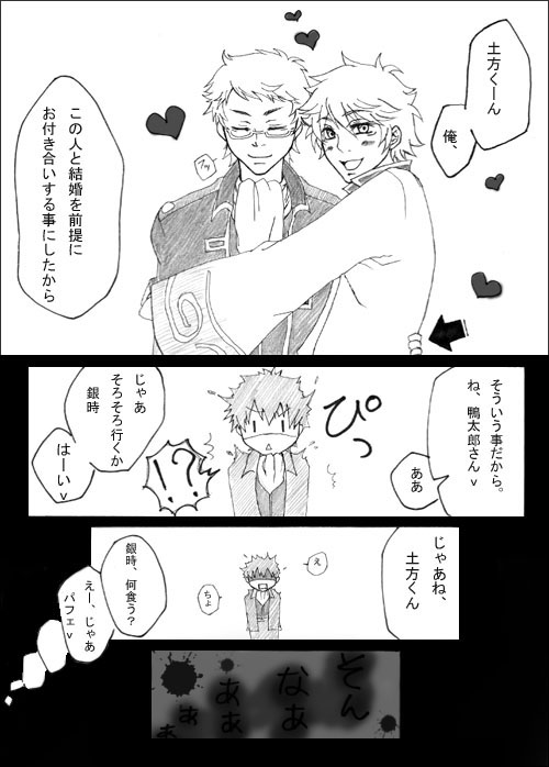 WJ17号第158訓の妄想まんがでした。 新キャラ出てきましたね〜! ようやく伊東さん登場で嬉しい限りですv お互い嫌悪してるので(味方によっては近藤さんの取り合いに見えます…!近藤さん受け…?) きっと色んな方法で互いの嫌がる事を仕掛けると思うんです。 …とすると、伊東さんは「土方の弱点=銀ちゃん」という情報を何処からか知り、 土方の見える所で銀ちゃんに近づくと思うんですよね…!(おま…!) …で、(私の中で)銀ちゃんはちょっと天然入ってるんで、気付かないんです、 自分が利用されてるって。 でね、なんとなく、伊東さんと仲良くなっちゃうの。 それでね、伊東さんの事好きになっちゃうんです。勿論、友達として。 「酒飲み仲間が増えたな〜」程度に思うといいです。 (その間、土方は隅っこから歯軋りしながら二人の様子を眺めてるといいです。 それか、銀ちゃんの目の前で伊東さんの悪口言っちゃったりして(銀ちゃんは単純に 友達として伊東さんの事が好きなので、悪口は許せないんです)銀ちゃんに呆れられたり するといいよ…!) 一方伊東さんは、何度か銀ちゃんと会ったり話して行くうちにね、だんだんと恋愛感情が 目覚めちゃったりしてね…(飛躍しすぎ…?) 「あれ?こいつこんなに色っぽかったっけ?」とか思うといいよ、酒の席で。 でね、酒の勢いに任せてキスしちゃったりして…。 つ、つまり、伊東さんは、始め土方に嫌がらせする為に銀ちゃんに近づいたんだけど、 最終的には銀ちゃんに惚れちゃったりして…! …すみませ…妄想膨らましすぎました(痛) 早く本誌で銀ちゃんと伊東さんの絡みが見たいです! そんな第158訓の感想でした…! |